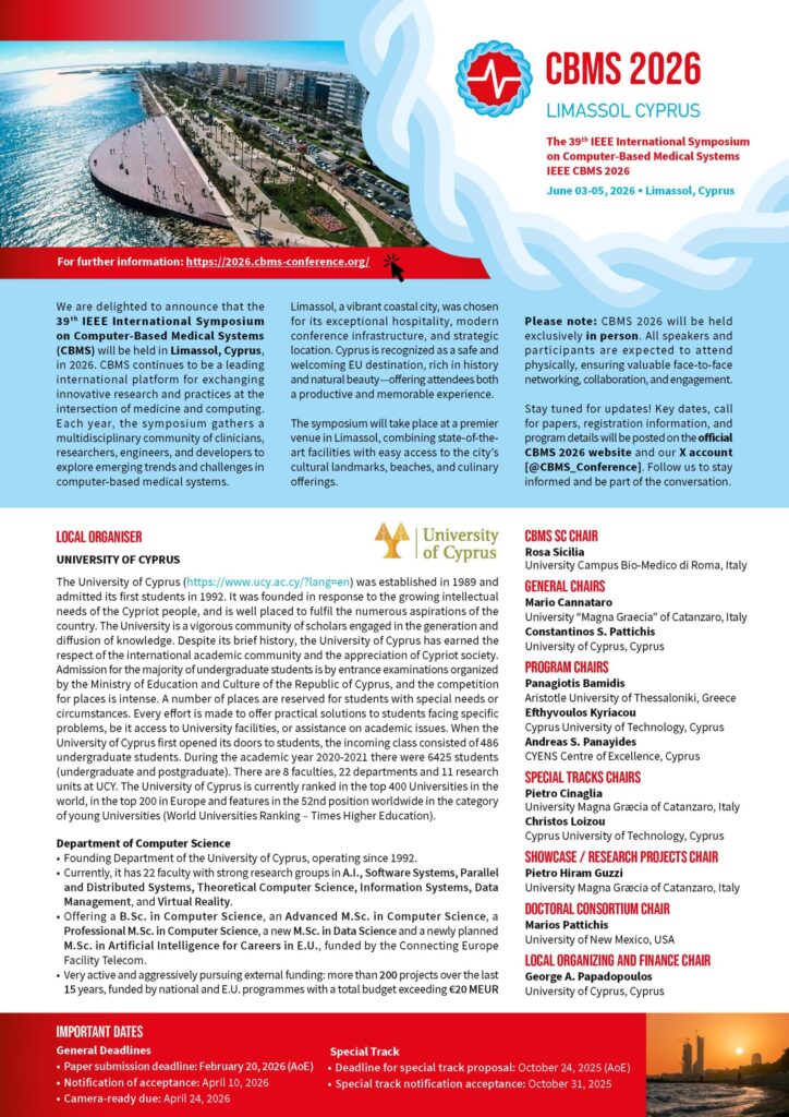 The 39th IEEE International Symposium on Computer-Based Medical Systems (CBMS 2026) will be held in Limassol, Cyprus, bringing together a leading international community at the intersection of medicine and computing. Each year, CBMS convenes clinicians, researchers, engineers, and developers to exchange innovative research and address emerging challenges in computer-based medical systems.